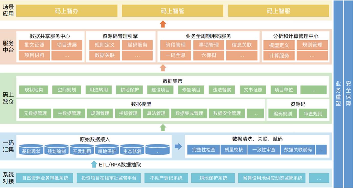 圍繞“整體智治”理念,以“空間碼”貫穿“現(xiàn)狀調(diào)查、規(guī)劃編制、前期策劃、用地報(bào)批、土地征收、土地供應(yīng)、工程建設(shè)、竣工驗(yàn)收、確權(quán)登記”全過程,各階段涉及的業(yè)務(wù)信息、文書材料、空間圖形等成果數(shù)據(jù)均通過“空間碼”歸集到“一地一碼”數(shù)據(jù)倉中,在此基礎(chǔ)上,構(gòu)建從編碼、賦碼到用碼的全方位的“一地一碼”業(yè)務(wù)協(xié)同應(yīng)用,推進(jìn)“碼上智辦”、“碼上智管”、“碼上智服”等各類場(chǎng)景關(guān)聯(lián)集成,逐步實(shí)現(xiàn)全領(lǐng)域、全要素、全過程的“碼上智治”。