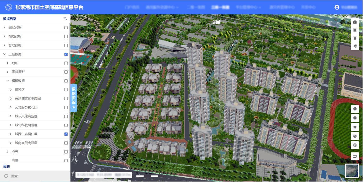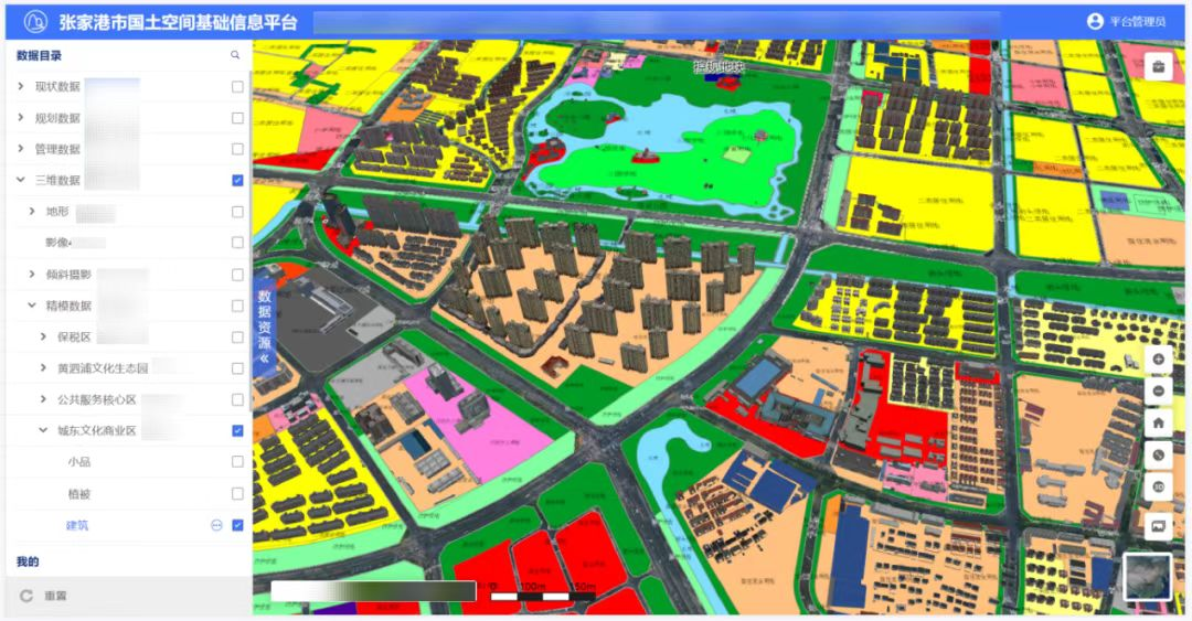 面向新時期國土空間治理新挑戰(zhàn)、業(yè)務管理新要求,張家港市國土空間基礎信息平臺立足實際情況,對自然資源多源大數(shù)據(jù)進行匯聚、分析、處理,匯集了現(xiàn)狀、規(guī)劃、管理、社會經(jīng)濟4大類、24中類、510個專題圖層,接入了地形、傾斜攝影三維模型、點云、精模、白模等三維數(shù)據(jù),整體形成了融合地形級、城市級、部件級實景三維的張家港市自然資源三維立體“一張圖”。
